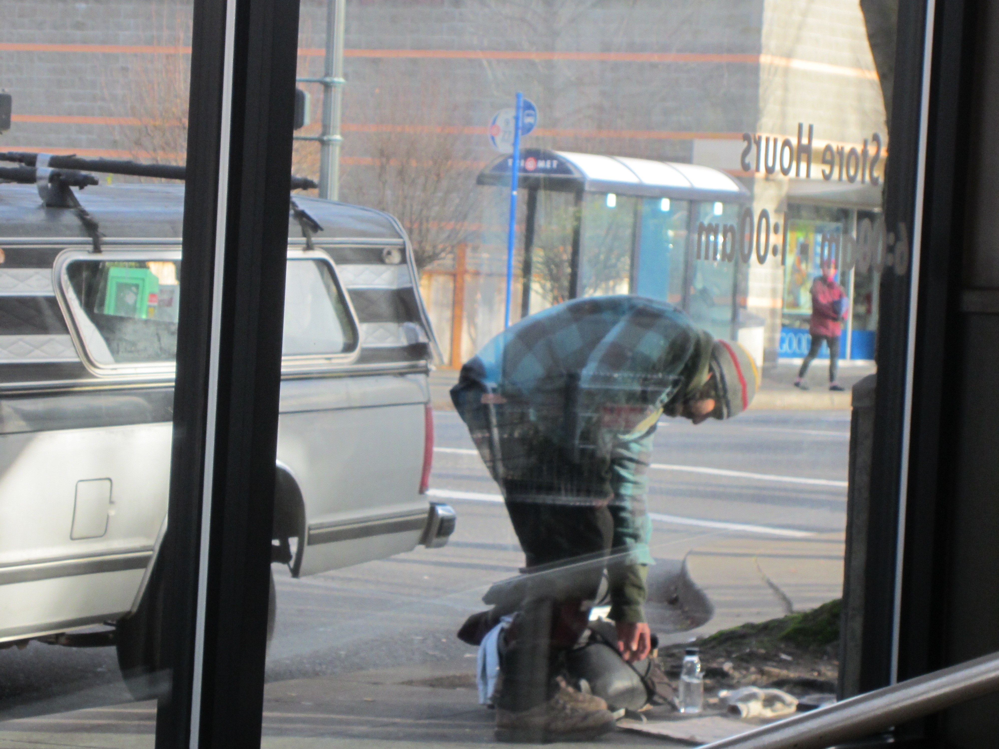 I gave him the $5 I had stuffed in my pocket in case I decided to stop for coffee. He was very appreciative. I snapped this photo of him from inside the store. He was already packing up. By the time I got outside he was gone.
